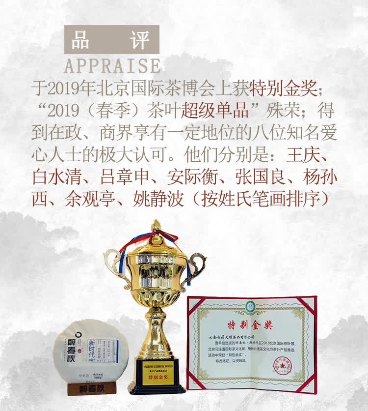 这款茶在2019年北京国际茶博会上斩获了"特别金奖",并荣获"2019(春季)茶叶超级单品"殊荣,得到了众多政商界知名爱心人士的极大认可。